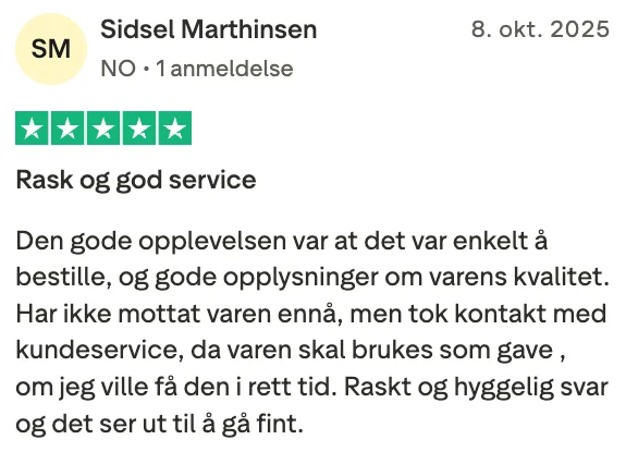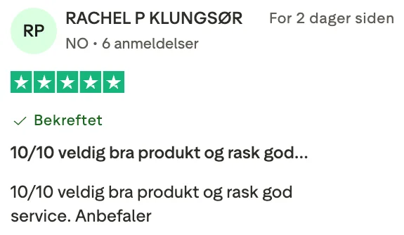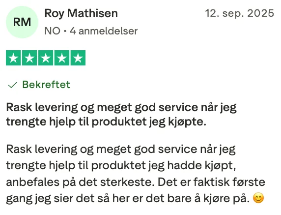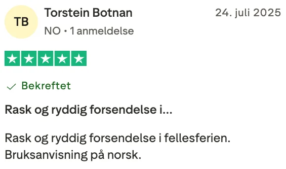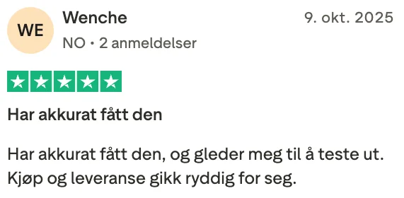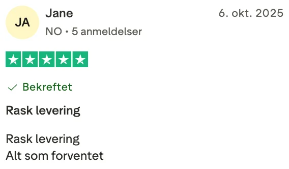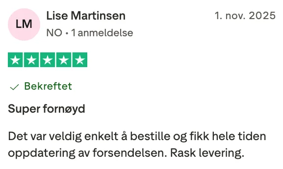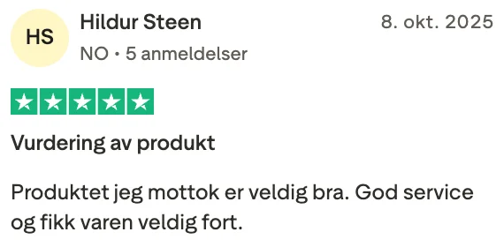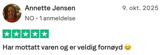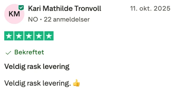Vi sender alle bestillinger direkte fra vårt lager i Oslo for rask og pålitelig levering, og du slipper å vente ukesvis på pakker som sendes fra utlandet. Bestiller du før kl. 08, sendes pakken som regel samme dag – og ofte også bestillinger som kommer inn senere.