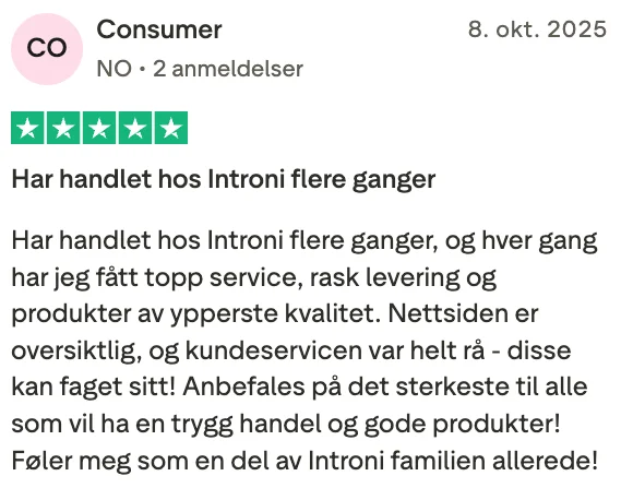 Les mer om frakt og retur her eller send e-post til kontakt@introni.no for å få informasjon om hvordan du går frem med din retur!